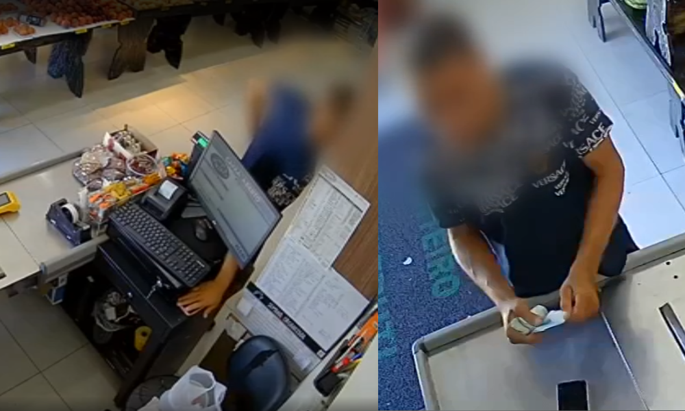 As imagens mostram o momento em que o suspeito pega o celular, que estava ao lado do caixa, às 11h18, e sai do estabelecimento. Às 11h40, ele volta com o aparelho e um maço de dinheiro, abordando duas funcionárias.